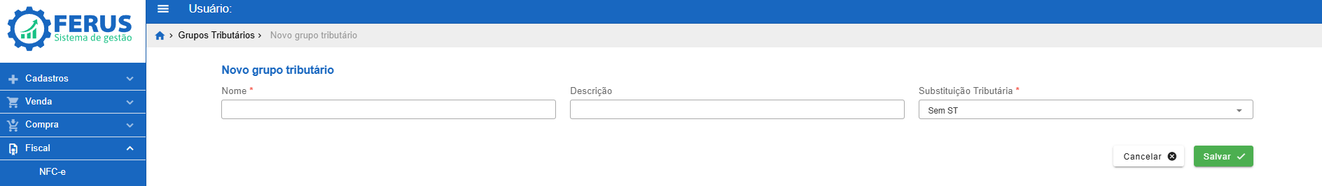 Acesse: Fiscal → Grupo tributário -> Novo Grupo tributário