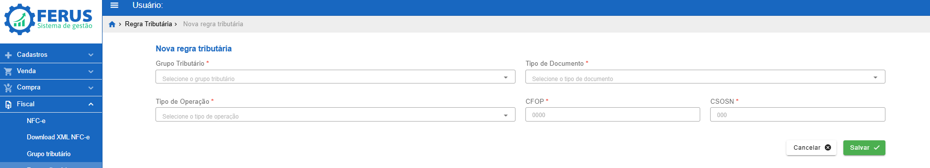 Selecione o grupo tributário, preencha os dados da regra e clique em Salvar.